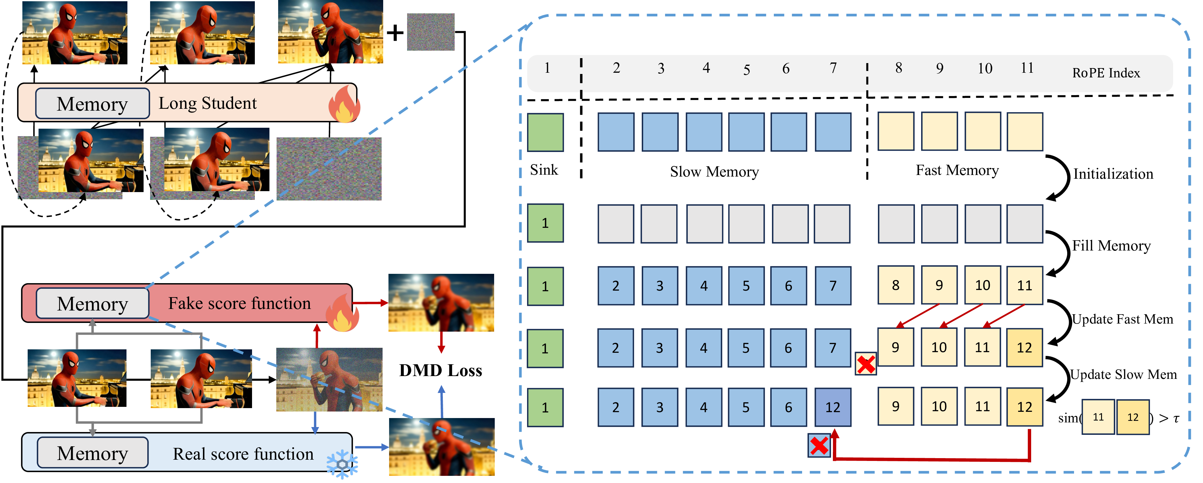 Context Forcing and Context Management System. We use KV Cache as the context memory, and we organize it into three parts: sink, slow memory and fast memory. During contextual DMD training, the long teacher provides supervision to the long student by utilizing the same context memory mechanism.