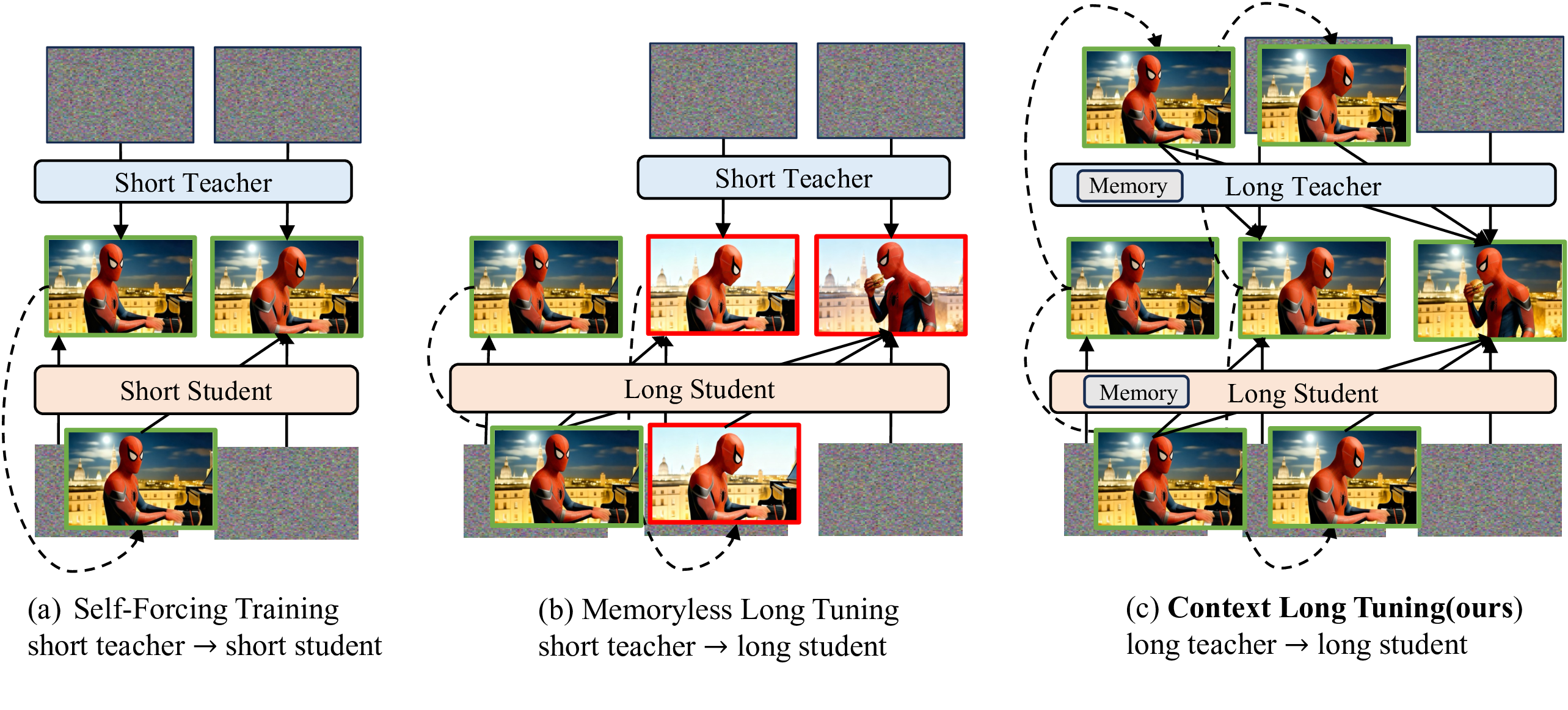 TL;DR: We propose Context Forcing, a framework that enables consistent long-video generation by aligning student and teacher context lengths. Paired with a Slow-Fast Memory system, it achieves $2\text{--}10\times$ longer context information than current state-of-the-art methods.